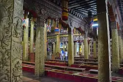 After a major refurbishing work carried out in the "zorig chusum tradition" [14] (an ancient tradition of crafts in wood carving, masonry, metal work, painting, and several other skills), the Dzong now has several new Lhakhangs, over 200 new religious images, and several other treasures. A consecration ceremony known as the "Rabney ceremony" performed by the Je Khenpo and the monks of the Dratshang (central monk body) was held from May 13 to 15, 2004, corresponding to the 12th to 14th day of the third Bhutanese month. The restoration works were largely funded by the Government of India and the Dzong stands fully restored to its past glory.[14] After complete restoration of the Dzong to its old glory, notable images, statues and thangkas are displayed in the Dzong. These include murals depicting life story of Buddha done during the rule of the second druk desi. Large gilded statues of Buddha, Guru Rinpoche and Zhabdrung which belong to mid 18th century, and gilded panels on pillars are also here.[6]