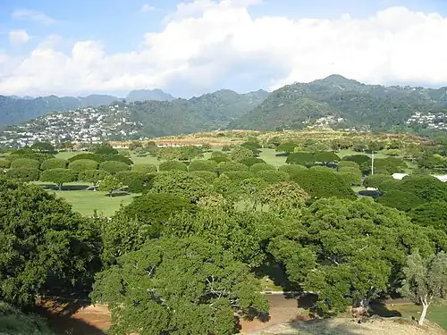 Although there are various translations of the Punchbowl's Hawaiian name, "Pūowaina," the most common is "Hill of Sacrifice." This translation closely relates to the history of the crater. The first known use was as an altar where Hawaiians offered human sacrifices to their gods and killed violators of the many taboos. Later, during the reign of Kamehameha the Great, a battery of two cannons was mounted at the rim of the crater to salute distinguished arrivals and signify important occasions. Early in the 1880s, leasehold land on the slopes of the Punchbowl opened for settlement and in the 1930s, the crater was used as a rifle range for the Hawaii National Guard. Anti-aircraft guns located there were fired during the Japanese attack December 7, 1941. The US Navy built the Nimitz Bowl in 1944 in Punchbowl Crater for USO Hawaii shows and sports.[1] Toward the end of World War II, tunnels were dug through the rim of the crater for the placement of shore batteries to guard Honolulu Harbor and the south edge of Pearl Harbor.