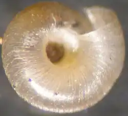 The shell of Punctum minutissimum is slightly translucent and pale brown in color. It is 1.1 to 1.3 mm wide, and has 3.5 to 4.5 whorls. The outer shell surface has a sculpture of radial striae, which are obvious under magnification. The underside of the shell has a very wide umbilicus, almost 25% of the shell's width.[1]