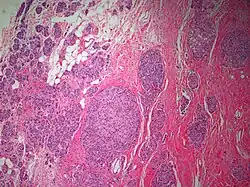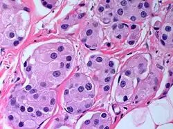 Pure apocrine carcinoma of the breast (PACB) is a rare carcinoma derived from the epithelial cells in the lactiferous ducts of the mammary gland.[1] The mammary gland is an apocrine gland.[2] Its lactiferous ducts have two layers of epithelial cells, a luminal layer which faces the duct's lumen (i.e. passageway) and a basal layer which lies beneath the luminal layer. There are at least four subtypes of epithelial cells in these ducts: luminal progenitor cells and luminal mature cells which reside in the luminal layer and mammary stem cells and basal cells which reside in the basal layer.[3] Examination of the genes expressed in PACB cancer cells indicate that most of these tumors consist of cells derived from luminal cells but a minority of these tumors consist of cells derived from basal cells.[4][5]