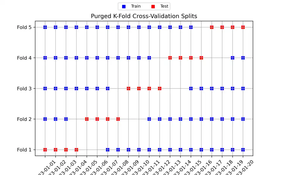 The second figure applies the Purged CV procedure. Notice how purging removes overlapping observations from the training set and the embargo widens the gap between test and training data. This approach ensures that the evaluation more closely resembles a true out-of-sample test and reduces the risk of backtest overfitting.