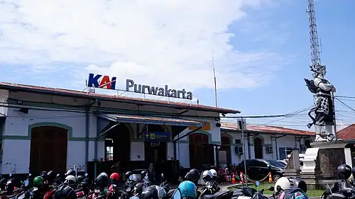 Purwakarta Station (PWK) (Sundanese: ᮞ᮪ᮒᮞᮤᮇᮔ᮪ ᮕᮥᮁᮝᮊᮁᮒ, romanized: Stasion Purwakarta) is a class I railway station located in Nagritengah, Purwakarta, Purwakarta Regency. The station, which is located at an altitude of +84 meters, is included in the Operational Area II Bandung. This station is located very close to the Purwakarta regent's office which can be reached on foot.