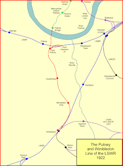 The Putney and Wimbledon line is a short railway route in south-west London. It was built by the London and South Western Railway as a collaborative arrangement with the Metropolitan District Railway. It was opened in 1889. The LSWR constructed Fulham Railway Bridge, although that was only ever used by District Railway trains. A spur connection from East Putney to the line from Barnes to Waterloo was used by LSWR trains.