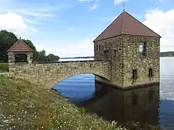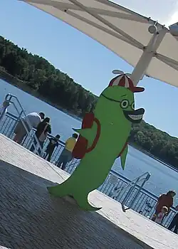 Along this spillway are a wildlife museum and the Linesville spillway, a site famous as the "Place Where the Ducks Walk on the Fishes' Backs".[2][7] Many people throw bread into the water here, and the resulting density of fish (carp) enables the ducks and other waterfowl to walk on top of the carp to vie for the thrown food. The spillway was renovated in 2007.[2] The Pennsylvania Department of Conservation and Natural Resources had planned to prohibit bread as food for the carp and ducks on January 1, 2009, only permitting commercial fish food as part of an effort to clean up the area and increase its wild nature, but subsequently reconsidered.[8]