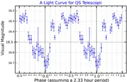 QS Telescopii is a faint, well-studied[4] binary star system in the southern constellation Telescopium.[7] It is composed of a white dwarf and main sequence donor star, locked into a close, circular orbit facing one another. Known as polars, material from the donor star does not form an accretion disk around the white dwarf, but rather streams directly onto it.[6] This is due to the presence of the white dwarf's strong magnetic field. The pair undergo frequent shifts between a high and low accretion states, and it shifts between single and double accretion poles. The main pole is partially self-eclipsing.[4]
