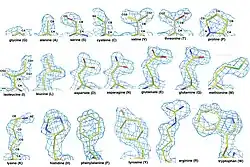 There are 3 types of alpha-helices and with nearly identical molecular structure, namely: a) 1.5Å per amino acid rise, b) 100˚ per amino acid turn, c) 3.6 amino acids and 360˚ per helical turn, and d) 5.4Å per helical turn. The 3 types of alpha-helices are: 1) mostly hydrophobic amino acids including Leucine (L), Isoleucine (I), Valine (V), Phenylalanine (F), Methionine (M) and Alanine (A) that are commonly found as the helical transmembrane segments in membrane proteins; 2) mostly hydrophilic amino acids including Aspartic acid (D), Glutamic acid (E), Glutamine (Q), Lysine (K), Arginine (R), Serine (S), Threonine (T), Tyrosine (Y) that are commonly found on the out layer in water-soluble globular proteins; 3) mixed hydrophobic and hydrophilic amino acids that are partitioned in 2 faces: hydrophobic face and hydrophilic face, in an analogy, like our fingers with front and back. These alpha-helices sometimes attach to surface of membrane lipid bilayer, or partially buried to the hydrophobic core and partially close to the surface of water-soluble globular proteins.[2]