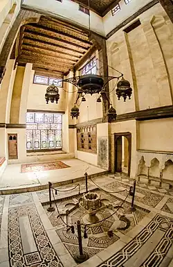 The qa'a is one of many reception rooms featured in the domestic architecture found in Egyptian Ottoman and other Islamic worlds e.g. Syria. A qa'a is featured in affluent houses of a merchant or a local political figure. The place is where the owner of the house would have a meeting or greet his guests. The qa'a didn't have any fixed furniture as it is influenced by the seasons. The qa'a is ideally located to the north side of the courtyard of a house, so that it could have taken advantage of the sun's rays during winter when the sun would be at the lowest. If the qa'a is used for the summer, they would have the windcatcher to direct breeze into the room during summer time. The qa'a can also be used as a sleeping room. In that case, there will be a larger niche where bedding rolls and carpets would be placed to be used for sleeping.[4]