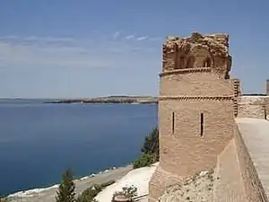 Qal'at Ja'bar (Arabic: قلعة جعبر, Turkish: Caber Kalesi) is a castle on the left bank of Lake Assad in Raqqa Governorate, Syria. Its site, formerly a prominent hill-top overlooking the Euphrates Valley, is now an island in Lake Assad that can only be reached by an artificial causeway. Although the hilltop on which the castle sits was possibly already fortified in the 7th century, the current structures are primarily the work of Nur ad-Din, who rebuilt the castle from 1168 onwards. Since 1965, several excavations have been carried out in and around the castle, as well as restoration works of the walls and towers. The castle was a Turkish exclave between 1921 and 1973.