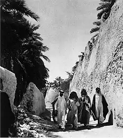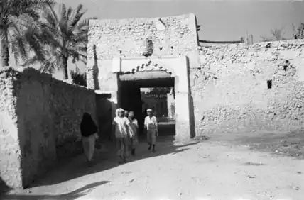 This photograph, taken in 1975, depicts one of the larger houses in Qatif Castle, with residents walking around it.