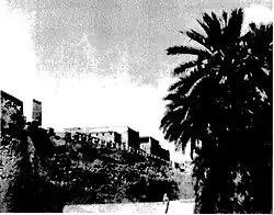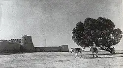 A view of the northern wall of Qatif Castle, connected to the palm forests of Mazraat al-Shammasiya, captured in 1945.
