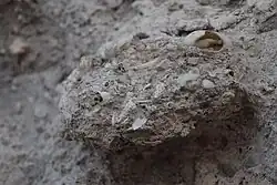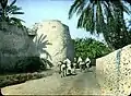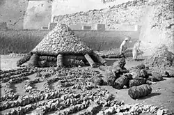 In front of the castle, limestone and palm trunks were gathered in piles for burning, plastering, and painting purposes. The photograph of this scene is estimated to date back to 1924 AD. The stone shown in the foreground is a sample of the material used in the castle's construction, specifically a marine mudstone known as furosh stone.[32]