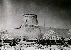 A photograph of the wall of Qatif Castle, featuring one of its towers, taken in 1930 AD.