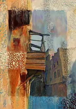A painting by Ali Al-Gaishi depicting the intricate details of the ancient architecture that once characterized the houses of Qatif Castle.