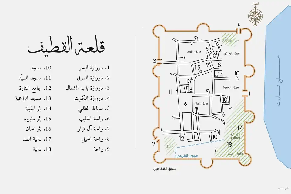 The Bedouins initiated a comprehensive siege of Qatif from multiple directions. They arrived in large numbers and established a camp on the western side of Qatif, near the palm groves of Dababiya. From there, they marched toward Qatif with the intention of seeking revenge. At that time, the city of Qatif comprised several areas, including Shuwaika, Dababiya, Al-Kweikb, Al-Shari'a, Mayas, Madaris, Bab Al-Shamal, Al-Jarari, and Qatif Castle.[57]