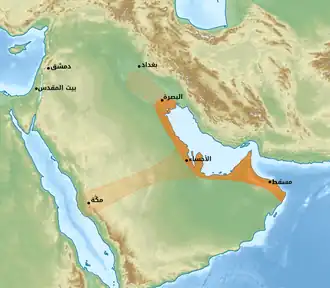 In the 880s and 890s, the Isma'ili Shi'a missionary Abu Sa'id al-Jannabi had established a strong following among the Bedouin tribes of Bahrayn.[3] In 899, the Isma'ili movement split between a branch that followed the leadership of the future Fatimid caliph, Abdallah al-Mahdi, and those who rejected his claims to the imamate, known as the "Qarmatians". Whether out of genuine conviction or political expediency, Abu Sa'id sided with the latter faction.[4][5][6] Allied with the local Bedouin tribes of the Banu Kilab and Banu Uqayl, as well as with the Persian Gulf merchants, Abu Sa'id was able to capture the region's capital, and in 900 cemented its independence by defeating an Abbasid army sent to recover control of Bahrayn.[7]
