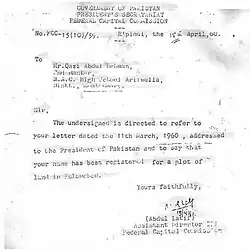 According to a history book by Muhammad Ismail Zabeeh, Qazi Abdur Rehman Amritsari proposed the name of the city.[2][3] On 11 March 1960, the Government of Pakistan confirmed that the name of Islamabad was proposed by Qazi Abdur Rehman Amritsari in a letter sent to him by the Federal Capital Commission.