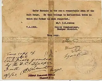 Khan Sahib, Qazi Zafar Hussain came from a qadi's family which had, since the 16th century, been prominent among the landed aristocracy of the Soon Valley. He belonged to Awans[1] tribe of ancient repute. He was awarded the title of Khan Sahib by the British Crown. This was a formal title, a compound of khan (leader) and sahib (Lord), which was conferred in Mughal Empire and British India. Although his father, Qazi Mian Muhammad Amjad forbade his descendants to establish Dargah, he was considered Sajjada Nashin by the people of his area. "Sajjada nashins" David Gilmartin asserts, "claimed to be the descendants of the Sufi,[2] 'saints', intermediaries between the Faithful and their God, and this cut against the grain of Islamic orthodoxy ... in kind, of their special religious status, these sajjada nashins had become men of local standing in their own right."[3] However he never claimed to be a Sajjada Nashin. In the Punjab, the sajjada nashin or pir families were not so rich in terms of land as the great land lords of Punjab but these sajjada nashin or pir families exerted great political and religious influence over the people.[4] The British could not administer the area without their help and no political party could win the election without their help.