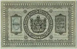 Qiang tie (Chinese: 羌帖; pinyin: qiāng tiē) is a Chinese folk name for banknotes of the Russian ruble issued by the Russian Empire and later by the White Army. The main regions of ruble transactions in China were concentrated along the Chinese Eastern Railway and Harbin in Manchuria and Ili and Tacheng in Xinjiang.[1] Russian currency in China began circulating in the 1860s and were withdrawn due to severe depreciation in the mid-1920s. There were many qiang tie sources, including the State Bank of the Russian Empire, the Russian Provisional Government, Omsk bonds issued by the Provisional All-Russian Government, the Russo-Chinese Bank, and the administration of the Eastern Railway.[2]