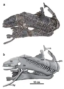 In Qianlong juveniles, the skull, mandible, forelimbs, and shoulder girdles are proportionally larger than the adults, similar to the related sauropodomorphs Massospondylus and Mussaurus.[1]