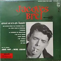 Quand on n'a que l'amour (English: When love is all you have) is the second studio album by Jacques Brel. Also known as Jacques Brel 2, the original album was released in April 1957 by Philips (N76.085R). The album was reissued on 23 September 2003 under the title Quand on n'a que l'amour as part of the 16-CD box set Boîte à bonbons by Barclay (980 816-4). The title song "Quand on n'a que l'amour" has been covered by Dalida, Céline Dion, Lara Fabian, Patricia Kaas, and Latifa, among others.[1][2]