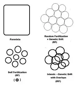 While panmixia may not be widely extant, the potential for it does occur, although it may be only ephemeral because of those local perturbations. It has been shown, for example, that the F2 derived from random fertilization of F1 individuals (an allogamous F2), following hybridization, is an origin of a new potentially panmictic population.[18][19] It has also been shown that if panmictic random fertilization occurred continually, it would maintain the same allele and genotype frequencies across each successive panmictic sexual generation—this being the Hardy Weinberg equilibrium.[13]: 34–39 [20][21][22][23] However, as soon as genetic drift was initiated by local random sampling of gametes, the equilibrium would cease.