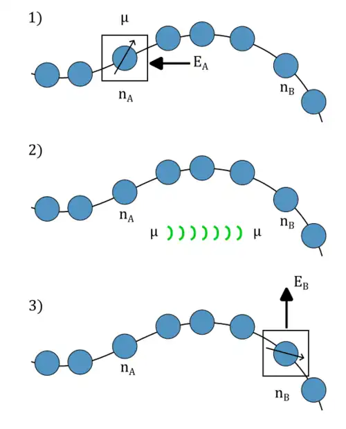 QET is studied through analyzing spin chain models. A spin chain is a type of model where a one dimensional chain of sites are assigned certain spin value at each site, typically +1/2 or -1/2 when considering spin-1/2. The spin of one individual site can interact with the spin of its adjacent neighbours, causing the entire system to be coupled together.[3]
