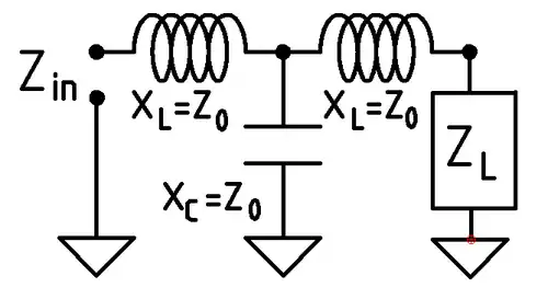 Similar properties can be realized using either a "T" or "PI" network consisting of lumped elements each of which has a reactance equal to the Zo of the simulated one-quarter wavelength (λ), transmission line. [8] This realization of the transformer is useful at lower frequencies where a quarter-wave transmission line would be impractically long. As with the physical transmission line, the relationship between the characteristic impedance, Z0, input impedance, Zin and load impedance, ZL is:
