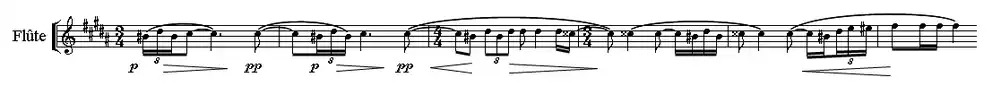 The instrumental formation is reduced effectively to chamber music, in which the piano is excluded.[10] Michel Duchesneau sees in this the influence of Schönberg's Pierrot Lunaire, which premièred in Vienna on 16 December 1912 and which motivated Ravel and Stravinsky to compose their own poems during 1913. The work of Schönberg was also to have been included in the 1914 concert programme.[11] Alexis Roland-Manuel refuted this influence on Delage, while Marius Flothuis sees the instrumental ensemble as closer to that which Ravel used in 1905 for his Introduction and Allegro,[12] which is left to flute, clarinet, harp, and string quartet.