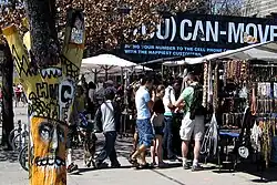 The area between Trinity Bellwoods Park and Roncesvalles Avenue has been referred to as "Queer West" or "Queer Street West",[29] an LGBTQ enclave in Toronto similar to the Church-Wellesley Village. The community started to form in the 1970s thanks to the General Idea artistic collective and their contributions to FILE Megazine.[30] In the 1980s, the Operation Soap police raids affected some of the gay bathhouses in the community like The Barracks.[31] As the area developed in the early 2000s, plans for condo expansions stirred gentrification concerns, leading to local "queer kiss-in" protests.[32] Over the years, the area has been home to various LGBTQ-friendly bars, restaurants, stores, and venues.[33] The Queer West community suffered several closures as a result of the COVID-19 pandemic.[34]