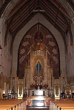 The church, designed in a Neo-Gothic style by Meyer and Cook, was completed in 1960. The large window over the choir loft features eight different shrines of the Virgin Mary: Our Lady of Czestochowa, Our Lady of Knock, Our Lady of Einsiedeln, Our Lady of the Snows, Our Lady of La Salette, Our Lady of Guadalupe, Our Lady of Lourdes and Our Lady of Fatima. This display alludes to the theme of the universality of the Catholic Church by highlighting that although these shrines are particular to a certain country or culture, the Cult of the Virgin Mary bridges over all these barriers, bringing together the different ethnic groups living in Sauganash area of Forest Glen. The original circa 1930s organ was replaced in 2006 due to its poor condition from age and an act of vandalism in the 1970s. The new instrument is a three-manual, 60-rank opus by Berghaus Pipe Organ Builders of Bellwood, Illinois.[1]