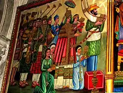 Piero della Francesca's frescoes in Arezzo (c. 1466) on the Legend of the True Cross contain two panels on the visit of the Queen of Sheba to Solomon. The legend links the beams of Solomon's palace (adored by Queen of Sheba) to the wood of the crucifixion. The Renaissance continuation of the analogy between the Queen's visit to Solomon and the adoration of the Magi is evident in the Triptych of the Adoration of the Magi (c. 1510) by Hieronymus Bosch.[85]
