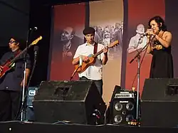 Quetzal was featured in the soundtrack to the 2004 short film Stand Up For Justice: The Ralph Lazo Story. In 2013, the band won a Grammy for Best Latin Pop, Rock or Urban Album.[2] Martha Gonzalez and Quetzal Flores are co-producers of Entre Mujeres, a CD released in 2012. The band was invited to speak and perform in the U.S. Library of Congress and Kennedy Center's Homegrown music series. The Smithsonian Institution's traveling exhibit "American Sabor: Latinos in U.S. Popular Music" feature Quetzal as leaders and innovators of Chicano music. Smithsonian Folkways label released the 2013 Grammy-winning CD Imaginaries, marking the importance of Gonzalez's past and ongoing work.[3] They have also been instrumental in developing Fandango Sin Fronteras, a dialog between Chicanos and Chicanas from California and jarochos-musicians who play the Veracruz style.