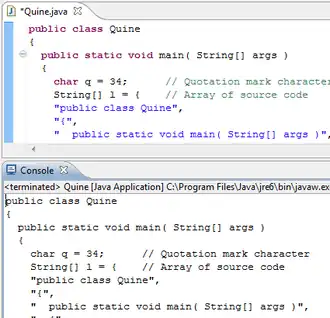 4. ^ "Simple Java quine, self replicating (Self copying) Java code, with text blocks. This code can be run with Java 15+ or Java 13+ with special flags. License is public domain, no rights reserved".