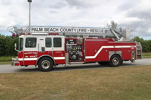 Palm Beach County Fire-Rescue Quint 57, stationed in suburban Boca Raton, Florida: This unit was manufactured by Ferrara Fire Apparatus, and is an example of a typical US quint setup.
