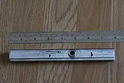 Top view of a Challenge Hi-Speed Quoin, model H M47, by The Challenge Mchry Co, Grand Haven, Michigan, U.S. The hole to the right of center is for a quoin key. The quoin is about 190 mm (7.5 in) long, and 18 mm (0.7 in) tall. The width expands by about 10 points, from 17 mm (0.68 in) to 21 mm (0.82 in) as the quoin key is turned clockwise.