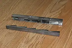 View of the parts of a disassembled Challenge Hi-Speed Quoin. The five wedges on the part in the foreground remain fixed, while five corresponding wedges in the background part slide when a quoin key (not shown) is inserted and turned. As the corresponding wedges move against each other, the quoin expands.