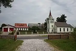 - A very modest church surrounded by an empty grassy courtyard and a wooden fence. The building is now covered with new grey tiles. It has an interesting tower - originally cubic, then becoming a prism with a regular polygonal base - topped by a simple helmet. Beneath the gallery, protected by a metal balustrade, are five tall, narrow, arched windows. Much larger windows of similar design are glazed with coloured glass and arranged in the shape of a cross, framed by a single-coloured border. They allow daylight to enter the sanctuary.