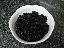 It is made from glutinous rice that has been fermented with the aid of yeast and steamed in a banana leaf. It may be either deep purplish-red or yellow in color depending on the variety of rice used. Rượu nếp is mildly alcoholic (rượu is the word for "alcohol" in Vietnamese). Depending on its consistency, it may be considered either a pudding or a wine. Thicker versions are eaten with a spoon, while more liquid varieties may be drunk as a beverage. Rượu nếp than is a brown-colored rice wine.[1]