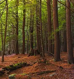 The first settlers in the area found a very dense forest that was according to Conrad Weiser, "so thick that for a mile at a time we could not find the place the size of a hand, where the sun could penetrate, even in the clearest day..." Some examples of this dense forest still stand today at R. B. Winter State Park. The Rapid Run Natural Area is 39 acres (16 ha) of land set aside "to provide a location for scientific observation of natural systems, to protect an example of a typical and unique plant and animal community, and to protect and outstanding example of natural interest and beauty." This natural area has been largely untouched since it was last logged for timber in 1850. Pileated woodpeckers can be seen in this area. Barred owls also live in the Rapid Run Natural Area. Vernal pools fill each spring to provide water for fairy shrimp, caddis-flies, spotted salamanders, and wood frogs.[4]