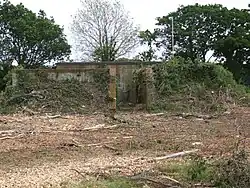 The airfield proper has for many years been occupied by a quarry which has effectively removed all trace of the flying field, whilst the site on which the technical site once lay is now a small village called Crossways, the original northern taxiway being still in use as a road through the village where two dispersal pans and the old ATC tower (albeit heavily converted to a public dwelling - Egdon House) still remain, and the old station cinema is now the village hall. The two bellman style hangars still remain, rumoured to be used by local farmers for fertilizer storage, plus an Over Blister hangar (one of eight built during the war) and other buildings exist in the woodland areas surrounding Crossways, although some have been demolished. One of the base's billets is now one of the local shops, and at the junction of Mount Skippet Way and Airfield Close in Crossways village housing is a memorial to the airfield, located in a grassed recreational area. During recent clearance work in preparation for new buildings on the North East side of the old airfield a brick block house and a concrete rifle range were revealed. Both have now been demolished but the photographs shown were taken just prior to their removal. Further clearances to build an access road across the south-east corner of the flying field has also resulted in the excavation of a group of the aircraft tie-down points.