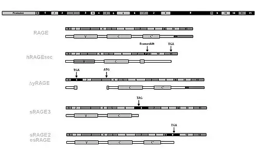 The primary transcript of the human RAGE gene (pre-mRNA) is thought to be alternatively spliced. So far about 6 isoforms including the full length transmembrane receptor have been found in different tissues such as lung, kidney, brain etc. Five of these 6 isoforms lack the transmembrane domain and are thus believed to be secreted from cells. Generally these isoforms are referred to as sRAGE (soluble RAGE) or esRAGE (endogenous secretory RAGE). One of the isoforms lacks the V-domain and is thus believed not to be able to bind RAGE ligands.