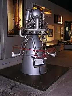 The RD-119 (GRAU Index 8D710) was a liquid rocket engine, burning liquid oxygen and UDMH in the gas-generator cycle.[3] It has a huge expansion ratio on the nozzle and uses a unique propellant combination to achieve an extremely high isp of 352 s for a semi-cryogenic gas-generator engine. It also has a unique steering mechanism. The engine main nozzle is fixed, and the output of the gas generator is fed into four nozzles on the side of the engine. Instead of using gimbaled verniers to supply vector control, the combustion gases are distributed by an electrically driven system that can control the thrust among the nozzles.