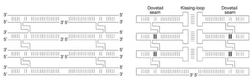 To produce a desired shape, the RNA origami method uses double-crossovers (DX) to arrange the RNA helices in parallel to each other to form a building block. While DNA origami requires the construction of DNA molecules from multiple strands, researchers were able to devise a method in making DX molecules from only one strand for RNA. This was done through adding hairpin motifs to the edges and kissing-loop complexes on internal helices. The addition of more DNA molecules on top of one another creates a junction known as the dovetail seam. This dovetail seam has base pairs that cross between adjacent junctions; thus, the structural seam along the junction becomes sequence-specific. An important aspect of these folding interactions is its folding; the order that interactions form can potentially create a situation in which one interaction blocks another, creating a knot. Because the kissing-loop interactions and dovetail interactions are a half-turn or shorter, they do not create these topological issues.[8]