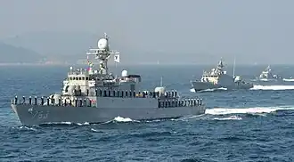 The Pohang class is a series of corvettes built by different Korean shipbuilding companies. The class consists of 24 ships and some after decommissioning are sold or given to other countries. There are five different types of designs in the class from Flight II to Flight VI.[1]