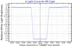 Discovered to be an eclipsing binary in 1979, it has a baseline magnitude of 14.36, dimming markedly every 7.2 hours for an interval of around 10 minutes, due to the total eclipse of the hotter star by the cooler one. Its variability in brightness led to its being given the variable star designation RR Caeli in 1984. There are very shallow secondary eclipses where the white dwarf transits across the red dwarf.[8]