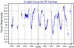 In 1898 it was announced that Louisa D. Wells had discovered that the star's brightness varies. The initial variable star designation given was R Carinae, but that name was eventually given to a different star.[10] It appears with its current name, RT Carinae, in Annie Jump Cannon's 1907 work, Second Catalogue of Variable Stars.[11] It is catalogued as an irregular variable star, but a number of possible pulsation periods have been detected. Analysis from observations over 40 years give variations with periods of 201 and 448 days, with other studies suggesting periods of 100 and 1,400 days.[12]