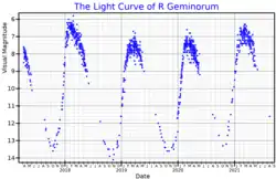 R Geminorum pulsates with an average period of 369.9 days, varying by up to eight magnitudes at visual wavelengths.[3] When at maximum light its apparent visual magnitude is usually between 6 and 7, while at minimum light it is typically near magnitude 14.[8]