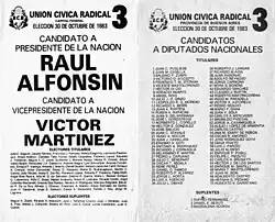 Alfonsín disputed the leadership of the UCR with Carlos Contín, but was unable to pass though the complex internal regulations of the party. He made a new political rally at the Luna Park, with a success comparable to a United States presidential primary. This new rally convinced Contín, who also ambitioned to be president, that he had no chances fighting against Alfonsín in proper primary elections. Fernando de la Rúa, who would have run in the primary elections against him, declined his candidacy because of Alfonsín's huge popularity.[16] Antonio Trocolli, another precandidate, declined to run as well.[14] Alfonsín was then appointed candidate of the UCR for the 1983 general elections, with Víctor Martínez as the candidate for the vice-presidency. The UCR proposed Alfonsín to run with De la Rúa as the candidate for the vice-presidency, to secure the conservative votes, but Alfonsín was confident to win the elections without help.[17]
