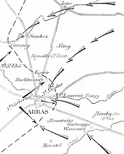 On 1 October, the French at Arras were pushed back from Guémappe, Wancourt and Monchy-le-Preux, until the arrival of X Corps.[50] By 1 October, two more French corps, three infantry and two cavalry divisions had been sent northwards to Amiens, Arras, Lens and Lille, which increased the Second Army to eight corps, along a front of 62 mi (100 km). Joffre ordered Castelnau to operate defensively, while Maud'huy and the subdivision d'armée advanced on Arras. On 28 September, Falkenhayn had ordered the 6th Army to conduct an offensive by the IV, Guard and I Bavarian corps near Arras and more offensives further north.[51][c] Rupprecht intended to halt the French west of Arras and envelop them around the north side of the city.[51] On 1 October, the French attacked to the south-east, expecting only a cavalry screen.[53]