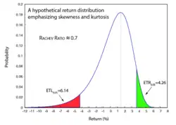 In quantitative finance, non-Gaussian return distributions are common. The Rachev ratio, as a risk-adjusted performance measurement, characterizes the skewness and kurtosis of the return distribution (see picture on the right).